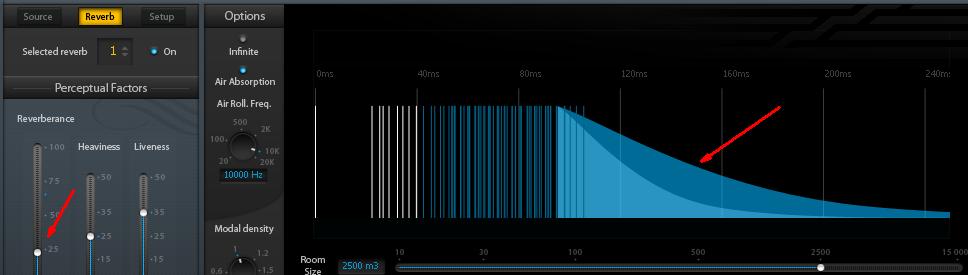 (3) Increase or decrease the source's radial projection (with the APERTURE parameter). Narrow radiation triggers less of the room's response, wider radiation triggers more. Important parameter.