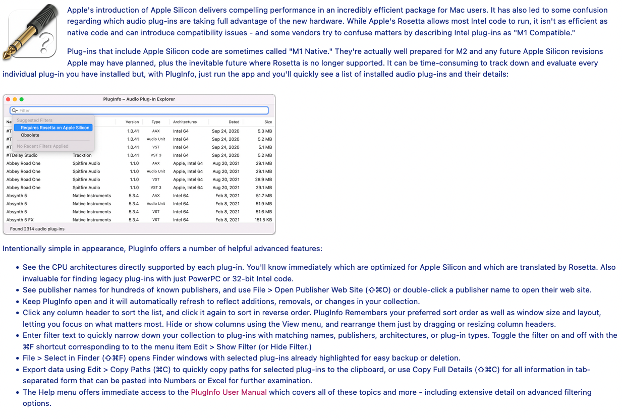 I recently discovered a great little app for Macs that is called PlugInfo. Basically, what it does is indicate whether each and every audio plugin on your computer (including AU, VST, VST 3, AAX etc.) is actually “M1 Native” or still “Intel”. Some developers continue to describe their plugins as M1 compatible, which can be confusing. The app is available in the Apple store for only $3-4. But first, if you are interested, you can read more about it here: