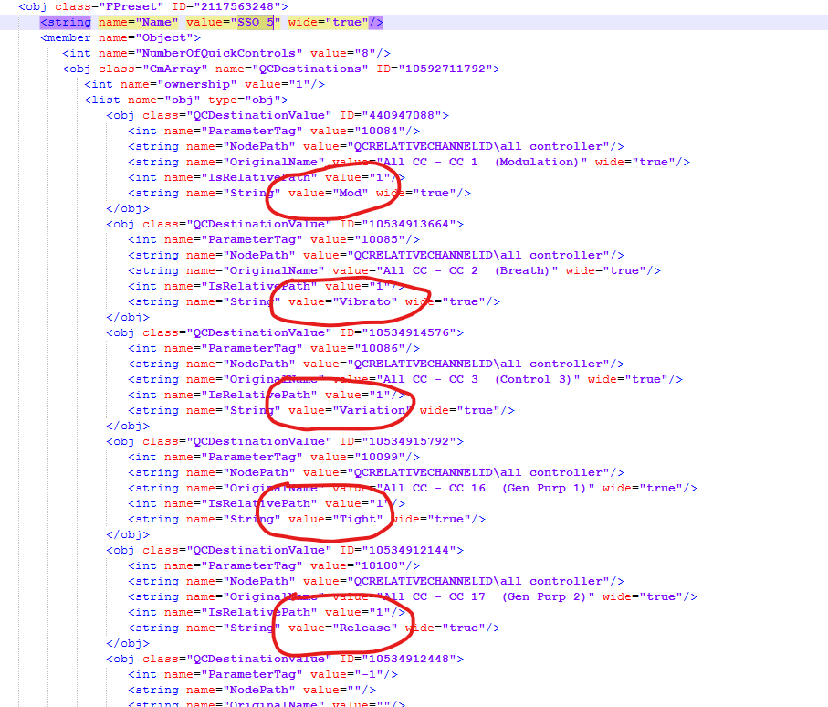 6. I've circled in red above all the values I changed to be useful to me - 5 red circles for the first 5 Quick Control labels. By default they will be the same as the OriginalName tag 2 rows up from each, so the first will default to "All CC - CC 1 (Modulation)". This is what you will want to change to your useful labels as I have done in this example.